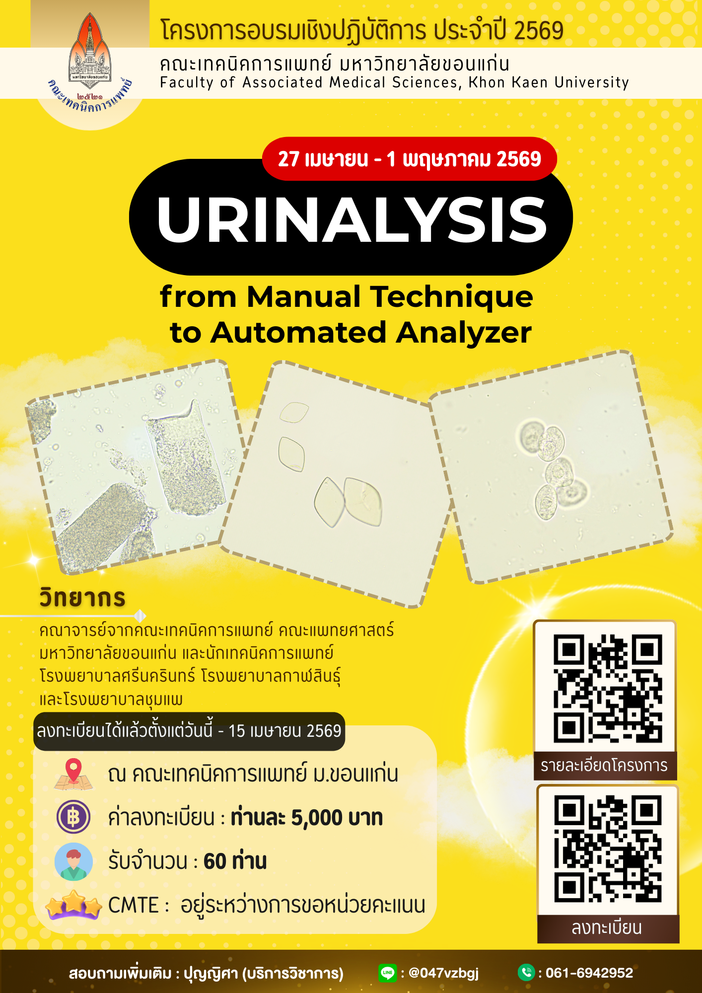อ่านต่อระหว่างวันที่ 27 เมษายน – 1 พฤษภาคม 2569 เปิดรับสมัครตั้งแต่วันนี้ – 15 เมษายน 2569 รายละเอียดโครงการ: https://kku.world/w0hkhs การอบรมครั้งนี้มุ่งเน้นการทบทวน ฟื้นฟู และเพิ่มเติมความรู้ด้านการตรวจวิเคราะห์ปัสสาวะ ครอบคลุมความสำคัญของการตรวจในโรคระบบทางเดินปัสสาวะ ตั้งแต่พื้นฐานทฤษฎีสู่การปฏิบัติจริง ทั้งวิธี manual และการวิเคราะห์ด้วยเครื่องวิเคราะห์อัตโนมัติ ผู้เข้าอบรมจะได้ฝึกดูตะกอนปัสสาวะจากตัวอย่างจริง วิเคราะห์ความสัมพันธ์ของผลตรวจกับอาการทางคลินิก เรียนรู้การรายงานผลอย่างถูกต้องตามมาตรฐาน ระบบประกันคุณภาพ ข้อจำกัดที่อาจพบ และแนวทางแก้ไขปัญหาในการตรวจ พร้อมทั้งร่วมอภิปรายแลกเปลี่ยนแนวทางเพิ่มประสิทธิภาพการตรวจปัสสาวะด้วยเครื่องวิเคราะห์อัตโนมัติ