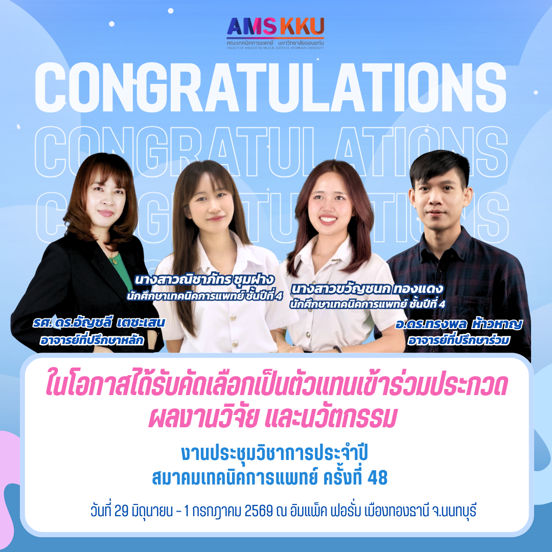 อ่านต่อคณะเทคนิคการแพทย์ มข. ขอแสดงความยินดีกับ ???? นางสาวขวัญชนก ทองแดง และ นางสาวณิชาภัทร ชุมฝาง นักศึกษาสาขาเทคนิคการแพทย์ ชั้นปีที่ 4 คณะเทคนิคการแพทย์ มหาวิทยาลัยขอนแก่น ที่ได้รับการคัดเลือกเป็นตัวแทนเข้าร่วมการประกวดผลงานวิจัยและนวัตกรรม ในการประชุมวิชาการประจำปีสมาคมเทคนิคการแพทย์ ครั้งที่ 48 ณ อิมแพ็ค ฟอรั่ม เมืองทองธานี จังหวัดนนทบุรี ระหว่างวันที่ 29 มิถุนายน – 1 กรกฎาคม 2569