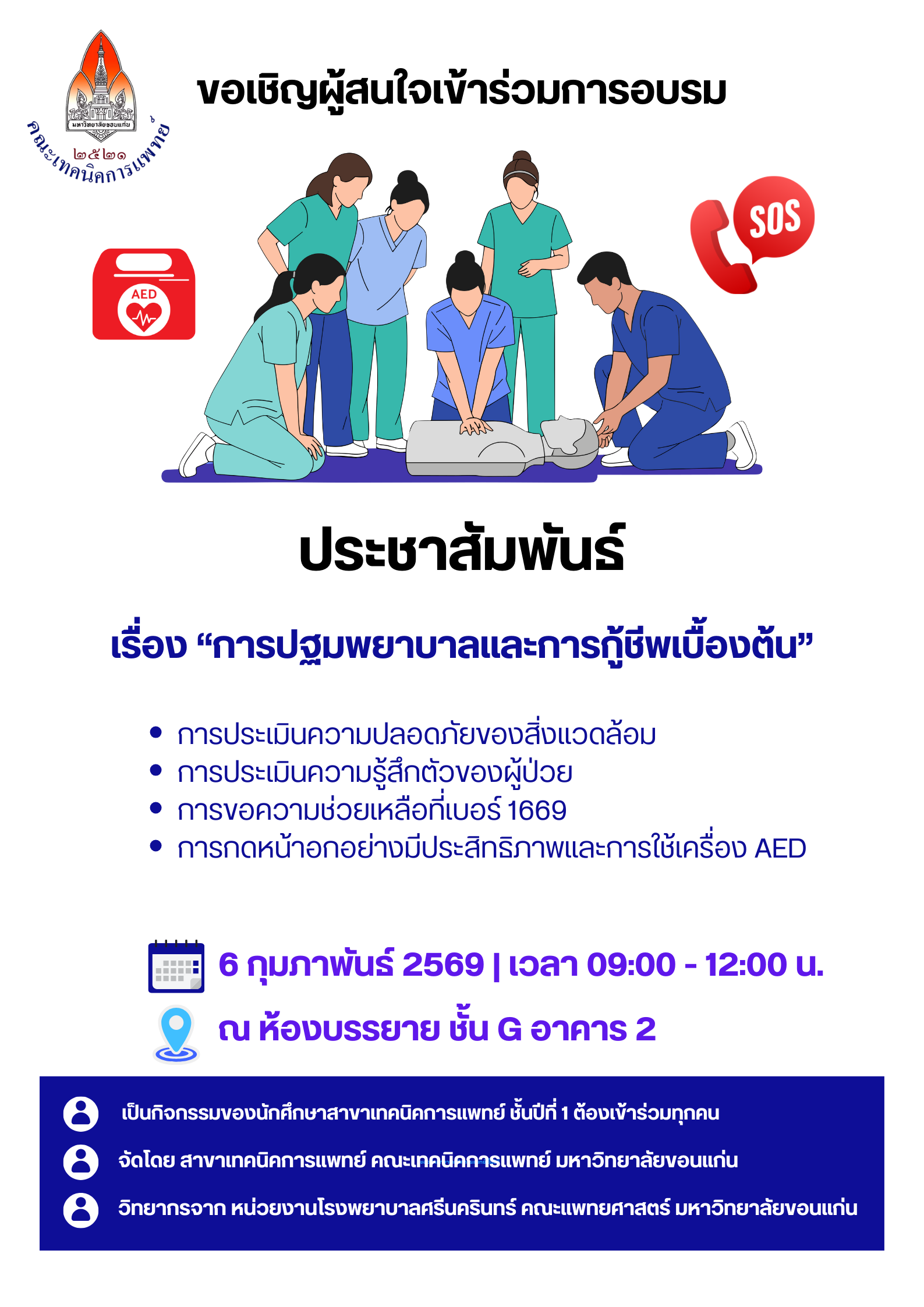 อ่านต่อเมื่อวันที่ 6 กุมภาพันธ์ 2569 เวลา 09.00–12.00 น. ณ ห้องบรรยาย ชั้น G อาคาร 2 คณะเทคนิคการแพทย์ มหาวิทยาลัยขอนแก่น ได้จัดกิจกรรมอบรมเชิงปฏิบัติการ เรื่อง “การปฐมพยาบาลและการกู้ชีพเบื้องต้น (Basic First Aid and Basic Life Support)” เพื่อเสริมสร้างความรู้และทักษะด้านการช่วยชีวิตขั้นพื้นฐานให้แก่นักศึกษาสาขาวิชาเทคนิคการแพทย์ ชั้นปีที่ 1