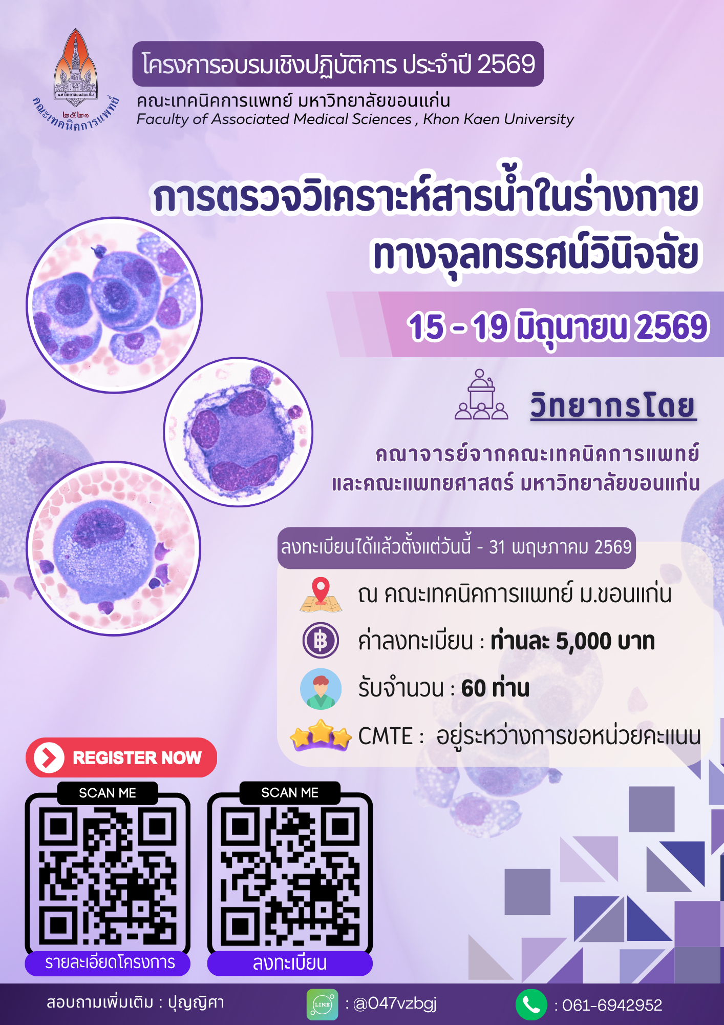 อ่านต่อคณะเทคนิคการแพทย์ มหาวิทยาลัยขอนแก่น ขอประชาสัมพันธ์การเปิดรับสมัครผู้เข้าร่วมอบรมเชิงปฏิบัติการ เรื่อง “การตรวจวิเคราะห์สารน้ำในร่างกายทางจุลทรรศน์วินิจฉัย” เพื่อเสริมสร้างและพัฒนาความรู้ ทักษะ และประสบการณ์ด้านการตรวจวิเคราะห์สารน้ำในร่างกายทางห้องปฏิบัติการอย่างถูกต้องและมีประสิทธิภาพ ระยะเวลาการอบรม ระหว่างวันที่ 15–19 มิถุนายน 2569 (รวม 5 วัน) รูปแบบการอบรมประกอบด้วยการบรรยาย การฝึกปฏิบัติจากตัวอย่างจริง และการเรียนรู้ผ่านกรณีศึกษา