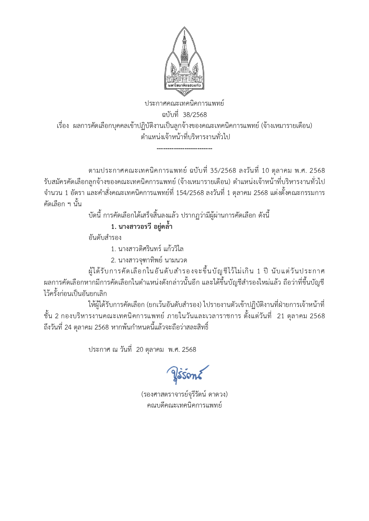 และให้ผู้ได้รับการคัดเลือก (ยกเว้นอันดับสำรอง) ไปรายงานตัวเข้าปฏิบัติงานที่ฝ่ายการเจ้าหน้าที่ ชั้น 2 กองบริหารงานคณะเทคนิคการแพทย์ ภายในวันและเวลาราชการ ตั้งแต่วันที่ 21 ตุลาคม 2568 ถึงวันที่ 24 ตุลาคม 2568 หากพ้นกำหนดนี้แล้วจะถือว่าสละสิทธิ์