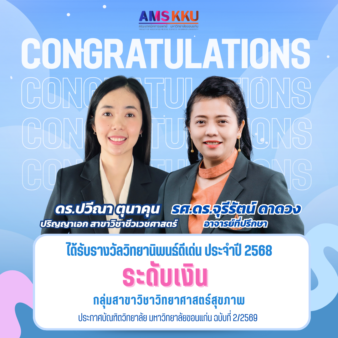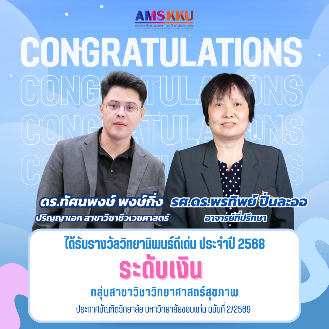 คณะเทคนิคการแพทย์ มหาวิทยาลัยขอนแก่น ขอแสดงความยินดี กับศิษย์เก่าคณะเทคนิคการแพทย์ จำนวน 5 ท่าน ที่ได้รับการประกาศเกียรติคุณ “ศิษย์เก่าแห่งความภาคภูมิใจ มหาวิทยาลัยขอนแก่น ประจำปี 2567–2568” ตามประกาศสมาคมศิษย์เก่ามหาวิทยาลัยขอนแก่น (ฉบับที่ 004/2568 และฉบับที่ 006/2568)